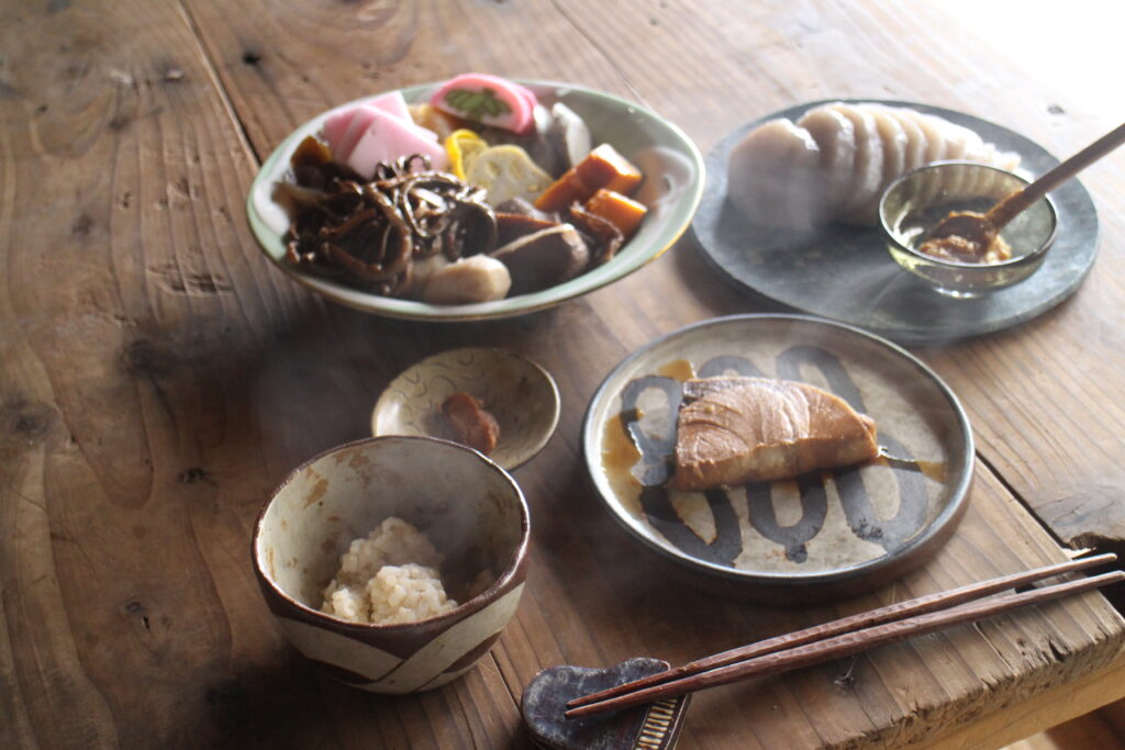 おせちをお隣りからいただいて手作りこんにゃくはご近所からブリは妹が送ってくれたので